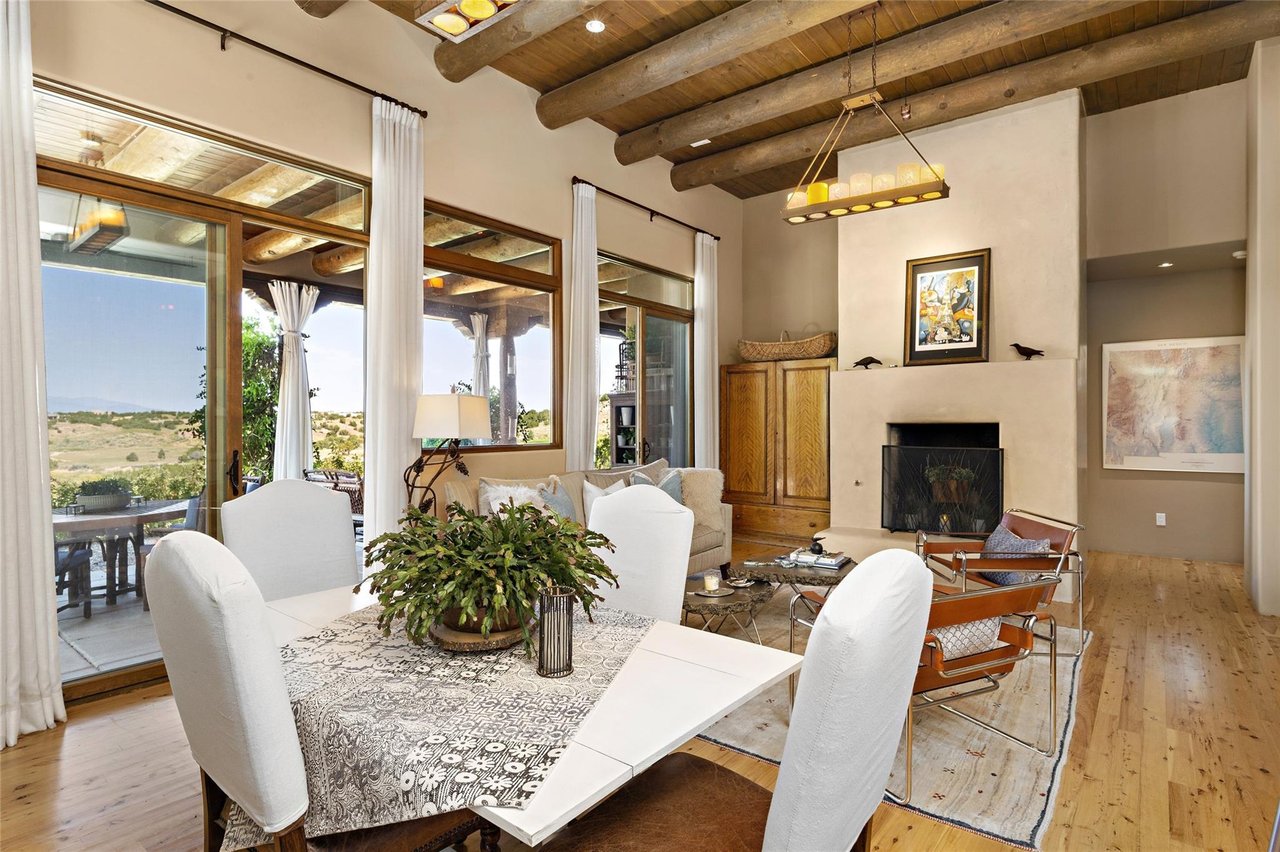 It's all about the Panoramic Views of the 15th hole of the Jack Nicklaus Sunset Course, snowcapped Jemez Mountain Range & Western Sunsets. This 4 Bedroom / 4 Bath Garden Home with open concept layout is in the Los Santeros Villas enclave of gated Las Campanas and offers "Lock & Leave" convenience. Wood entry gates lead to a lush, landscaped courtyard with two running stream water features. Kitchen includes stainless appliances as well as dramatic black oak cabinets, upgraded granite counters & prep sink. Living / Dining area has a wood-burning fireplace and a wall of glass leading to the back portal on the view. Elegant Primary Bedroom Suite offers views, double vessel sinks on a custom cabinet, shower, jetted tub & walk-in closet. Bedroom Two / Media has an adjacent bath plus access to side courtyard. Upstairs Bedroom Three over the garage can be an office or retreat. Private, detached One Bedroom, One Bath Guest Casita / Bedroom Four offers great privacy for visiting friends or family. Forced air heating & central A/C. This home has it all - Views, Style & Flexibility with Four Bedrooms.